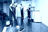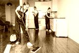 Cleaning service with professional equipment during work. professional kitchenette cleaning, sofa dry cleaning, window and floor washing. man and women in uniform, overalls and rubber gloves