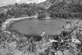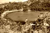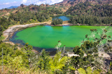 beautiful landscape view of the Telaga Warna lake surrounded by trees, taken from the height area/aerial view, selectively focused