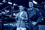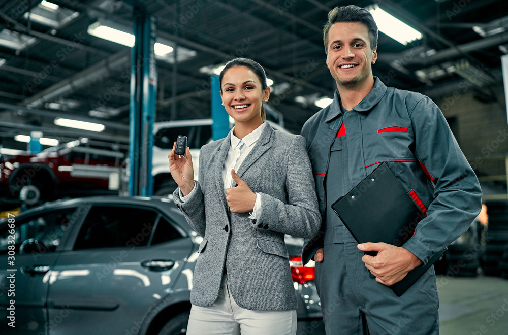 Beautiful businesswoman with keys shows thumb up and auto service mechanic with documents. Car repair and maintenance.
