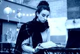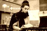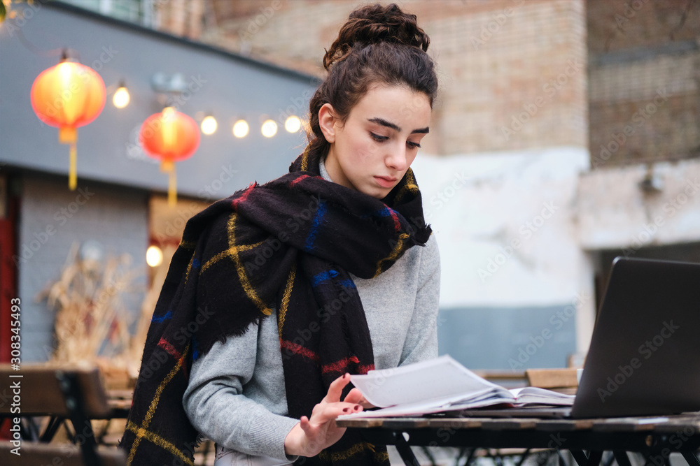 Concentrated casual brunette girl with scarf reading book studying with laptop in cafe on city street