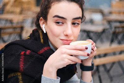Portrait of pretty brunette girl with wireless earphones drinking coffee while wistfully looking away outdoor