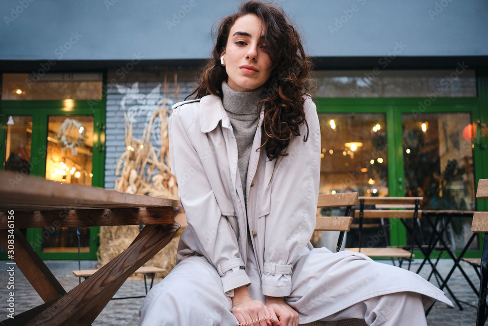 Beautiful sensual brunette girl in trench coat intently looking in camera in cafe on city street
