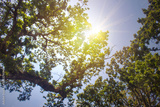 Beautiful bottom view of green tree with blue sky background, Dark forest with flare light, Beautiful nature view under the tree in summer, selective focus