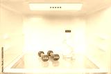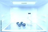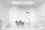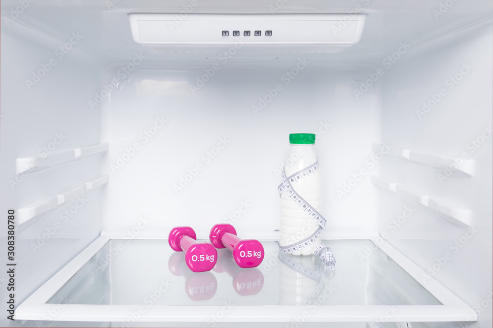 in an empty white refrigerator two pink dumbbells and a bottle with kefir and a measuring tape, concept of kefir diet