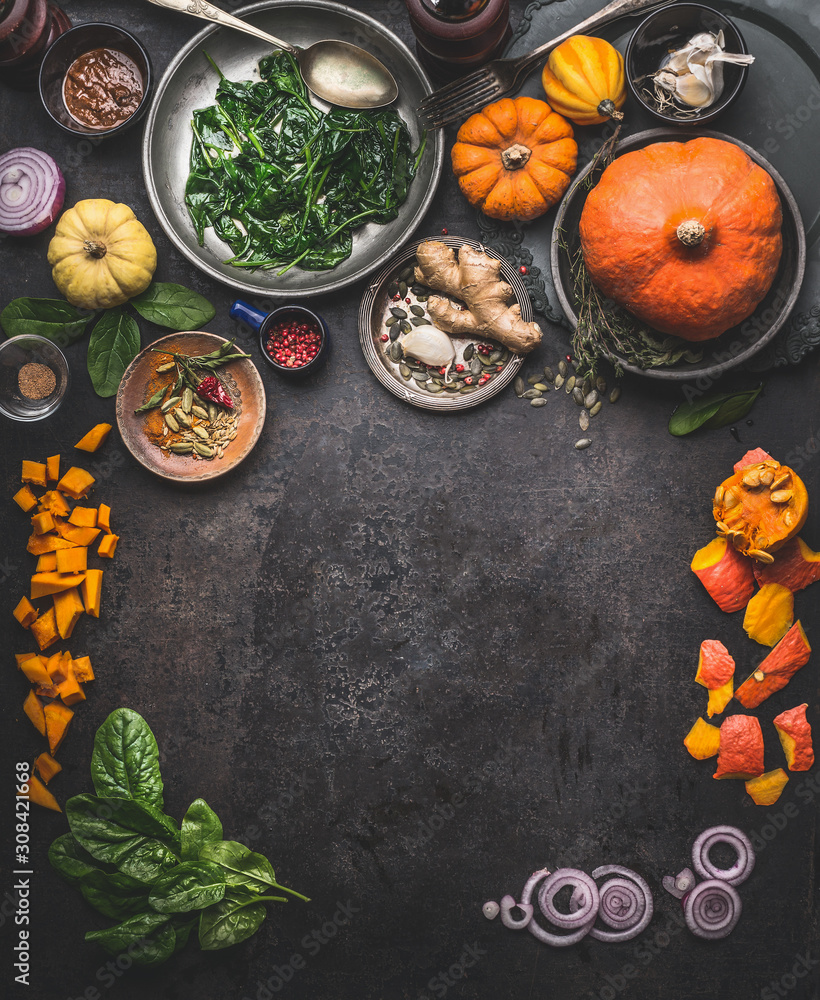 Vegetarian seasonal food background with ingredients for herbs and winter cooking: pumpkin,spinach, ginger, onion. Top view. Frame. Copy space