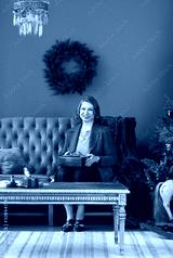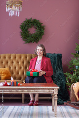 Grateful smiling mature woman is holding Christmas or New Year gift box in hands. Preparation for winter holiday season concept.