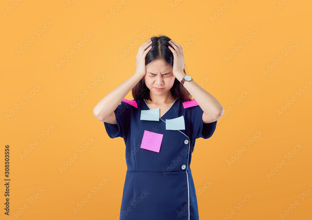 Unhappy young Asian woman standing with holding hair and feeling confused with something on orange background.