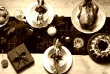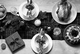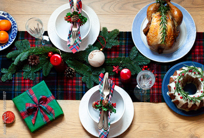 Traditional Christmas or New Year dinner flat lay. Winter holiday food on the wooden table top view