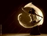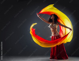 beautiful black-haired girl in red ethnic dress on the stage dances oriental dancing waving fabric in her hands