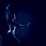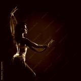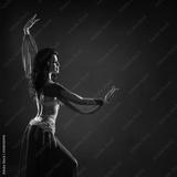 beautiful black-haired girl in red ethnic dress dancing oriental dances in the dark