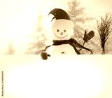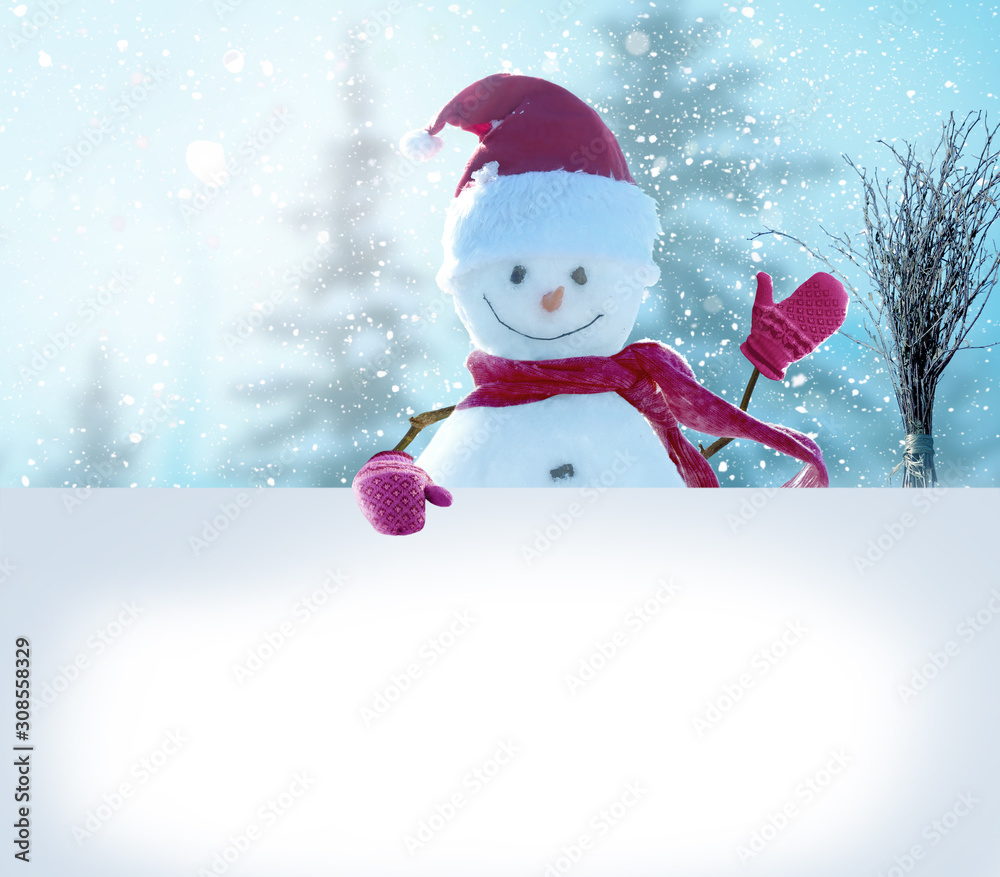 Merry Christmas and happy New Year greeting card. Snowman standing in winter Christmas landscape and points to a white billboard.