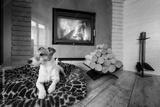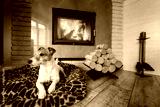 Jack russel terrier sleeping on a white rug near the burning fireplace. Resting dog. Hygge concept