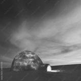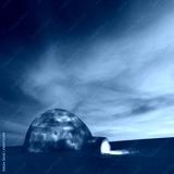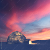 Real snow igloo house in the winter mountains glowing by evening sunlight. Incredible purple sunset with glowing clouds on the background. Winter holiday concept
