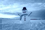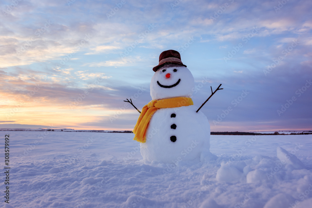 Funny snowman in stylish black hat and yellow scalf on snowy field. Merry Christmass and happy New Year!