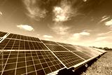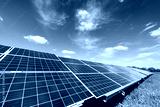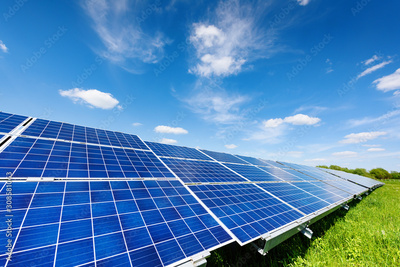 Solar panel on blue sky background. Green grass and cloudy sky. Alternative energy concept
