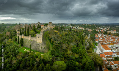 Aerial view of Tomar castle and convent on a winter afternoon in Portugal