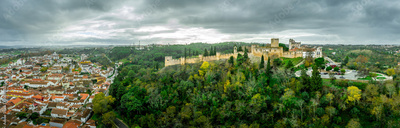 Aerial view of Tomar castle and convent on a winter afternoon in Portugal