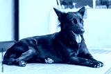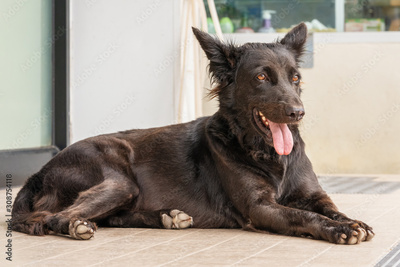 Black gray dog mutt is suffering from the heat on the street in the city. He stuck his tongue out from the heat. close up.