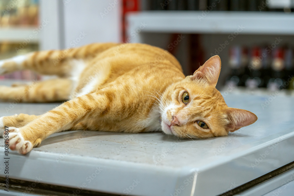 Ginger orange young Shorthair cat rests on a fridge in a shop in Thailand, looking at the camera