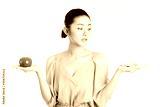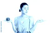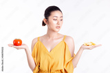Diet concept. Beautiful young asian woman looks at delicious snack, potato chip. Attractive girl consider, restrain for stopping eat snack because she gets slimming plans. She hold tomato, potato chip