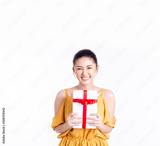 Young asian woman receive new year or birthday present that makes her happiness, smile or attractive beautiful girl giving Christmas gift to special persons. She get toothy smile copy space above head
