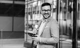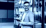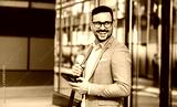 Businessman with mobile phone and bag in front of the corporation. Business, education, lifestyle concept