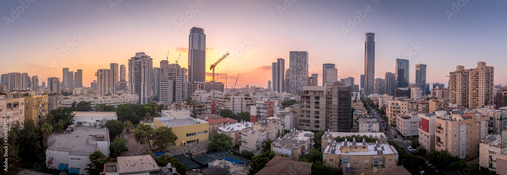 Aerial sunset panorama view of Tel Aviv financial district, Givatayim, , Givat Amal, Tel Binyamin, Givat Rambam, Montefiore with skyscrapers and cranes working on new construction in Israel