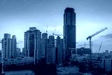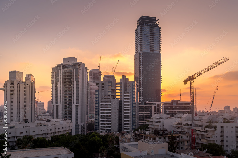 Aerial sunset panorama view of Tel Aviv financial district, Givatayim, , Givat Amal, Tel Binyamin, Givat Rambam, Montefiore with skyscrapers and cranes working on new construction in Israel