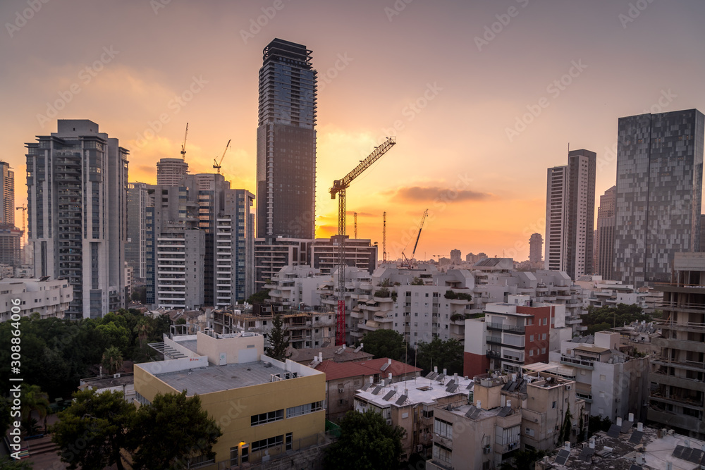 Aerial sunset panorama view of Tel Aviv financial district, Givatayim, , Givat Amal, Tel Binyamin, Givat Rambam, Montefiore with skyscrapers and cranes working on new construction in Israel