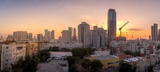 Aerial sunset panorama view of Tel Aviv financial district, Givatayim, , Givat Amal, Tel Binyamin, Givat Rambam, Montefiore with skyscrapers and cranes working on new construction in Israel