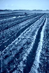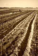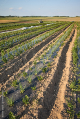 Agricultural landscape at sunset, farm field with patches covered with plastic mulch used to suppress weeds and conserve water.