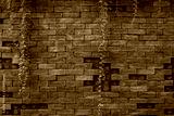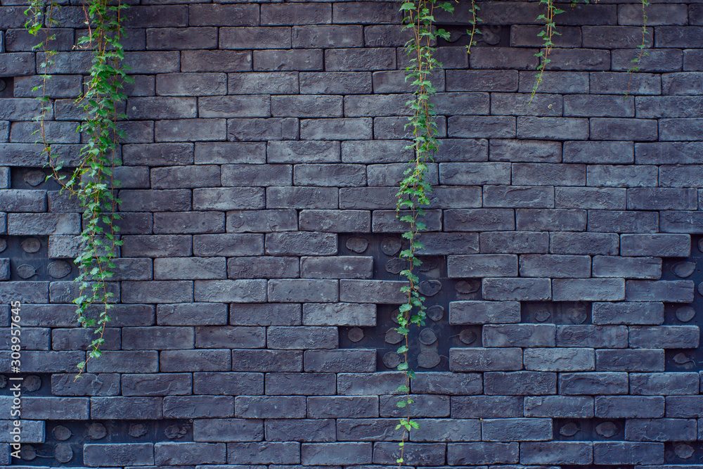 Ivy vines in front of a black brick wall.