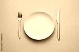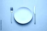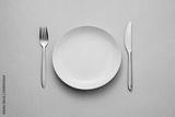 Clean empty white plate with knife and fork