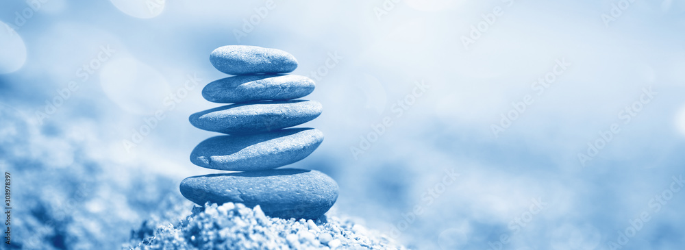 Balance of stones on the beach. Color of the year 2020 classic blue toned
