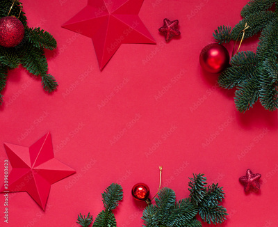 Christmas or New Year concept red frame with festive decoration. Copy space. Chinese or Lunar New Year greeting card
