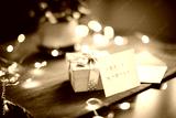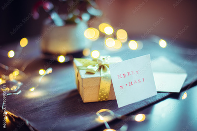 Close up hand made stamp Merry Christmas card, vintage gift box with golden ribbon and festive composition with lights garland on gray napkin. Dark scandinavian style. Copy space, Soft selective focus