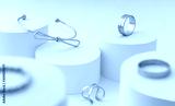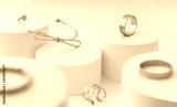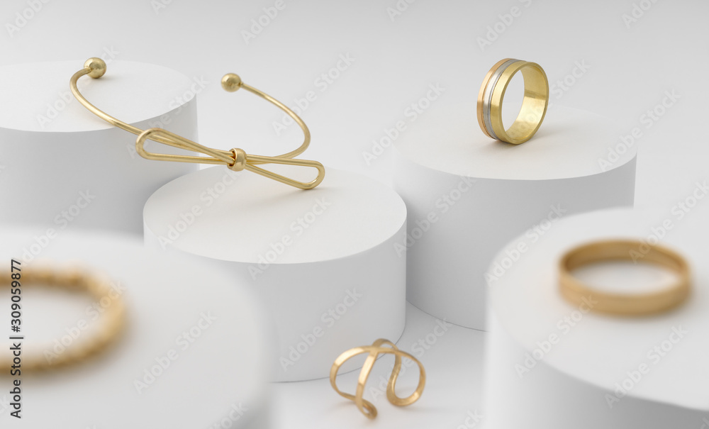 Modern Golden bow shape bracelet and rings collection on white cylinders platform
