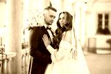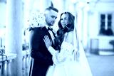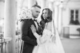 Beautiful young wedding couple posing with bouquet of flowers in hands