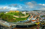 Aerial panorama of the medieval castle with Moorish origins in Torres Vedras Portugal with restored castle church and keep