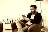 Trendy handsome Gen z Indian arabic man typing on mobile phone, sitting in waiting room before interview