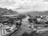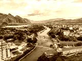 Bamboo bridge over Nam Song River at Vang Vieng village, Laos. Top view of city. Urban landscape. Beautiful nature of Asia.