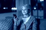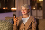 technology, communication and people concept - happy senior woman with smartphone at home in evening