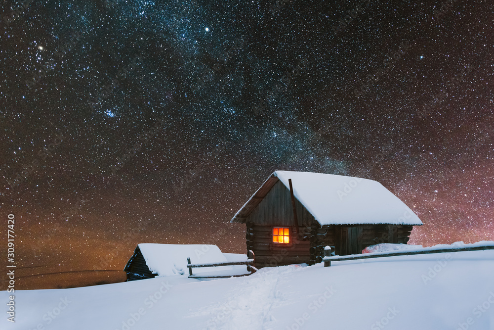 Dramatic wintry scene with snowy house with warm light in window. Fantastic night landscape glowing by milky way. Winter in high mountains
