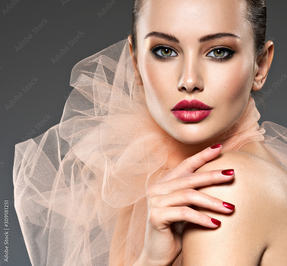 fashion woman with stylish makeup, red nails and lips wearing beige scarf