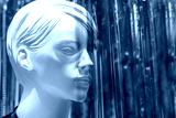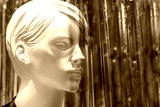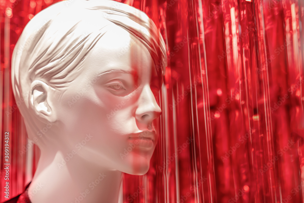 stylish beauty blur mannequin female head on a blurred bright colored red background, light red tinting. Good layout blank for fashion and beauty advertising. close-up, copyspace