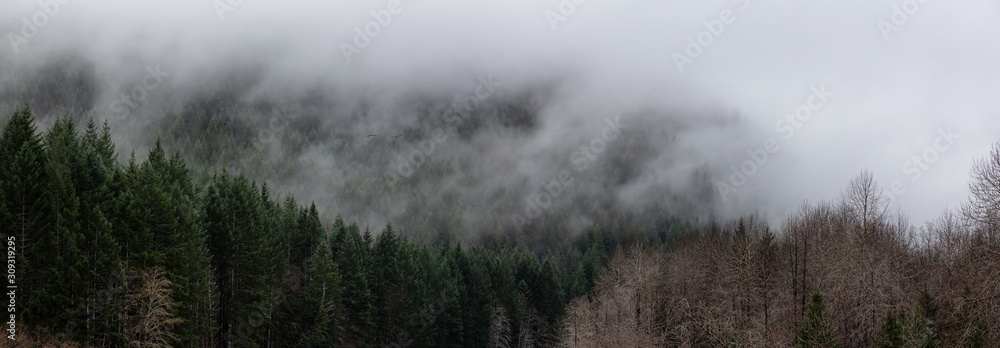Beautiful Panoramic View of Canadian Nature Landscape during a cloudy day. Taken between Tofino and Port Alberni, Vancouver Island, British Columbia, Canada.