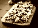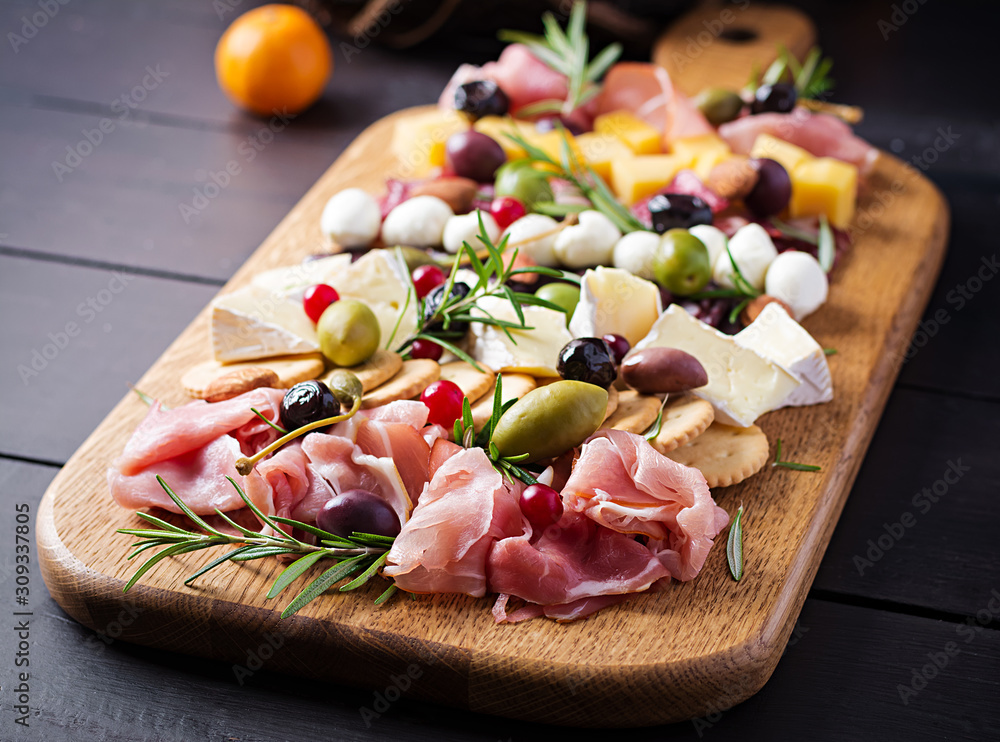 Antipasto platter with ham, prosciutto, salami, cheese, crackers and olives on a wooden background. Christmas table.