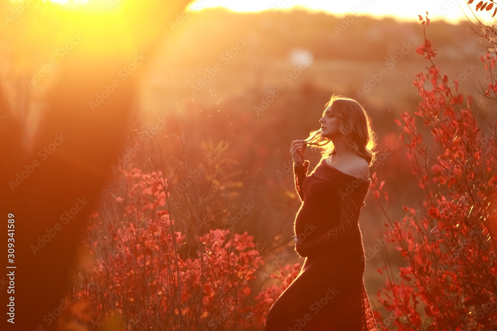 Beautiful woman outdoor in the sunset on the background of a natural Park.
