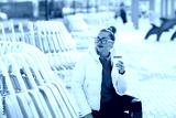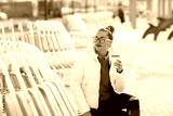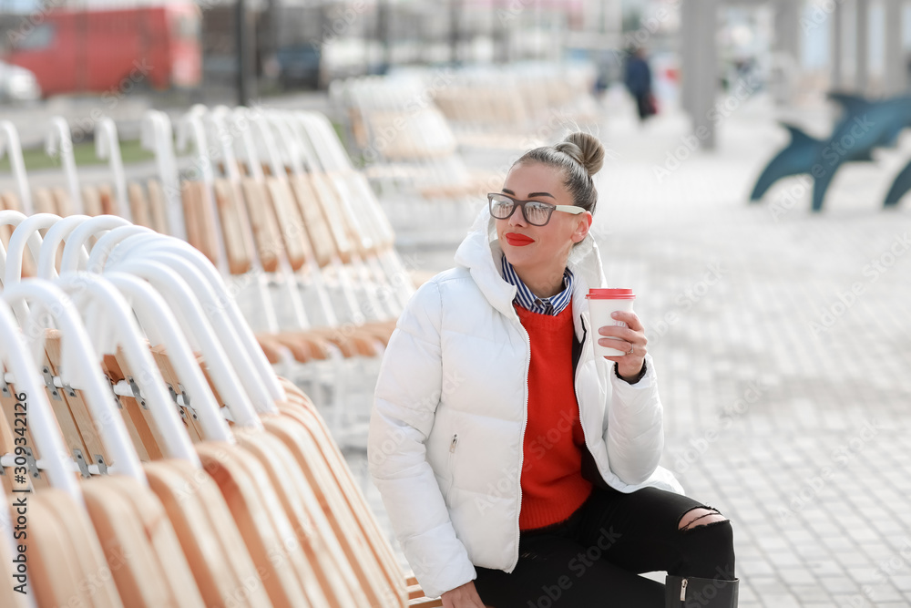 Beautiful woman with glasses sitting on the street and drinking coffee.