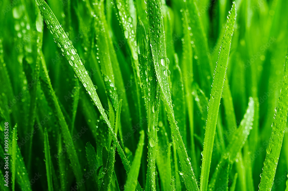 Wheat germ. Wheatgrass. Water drops on fresh leaves